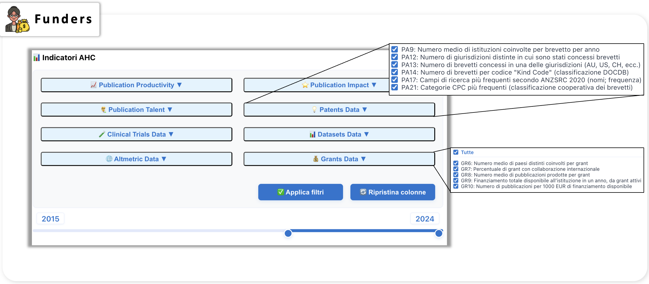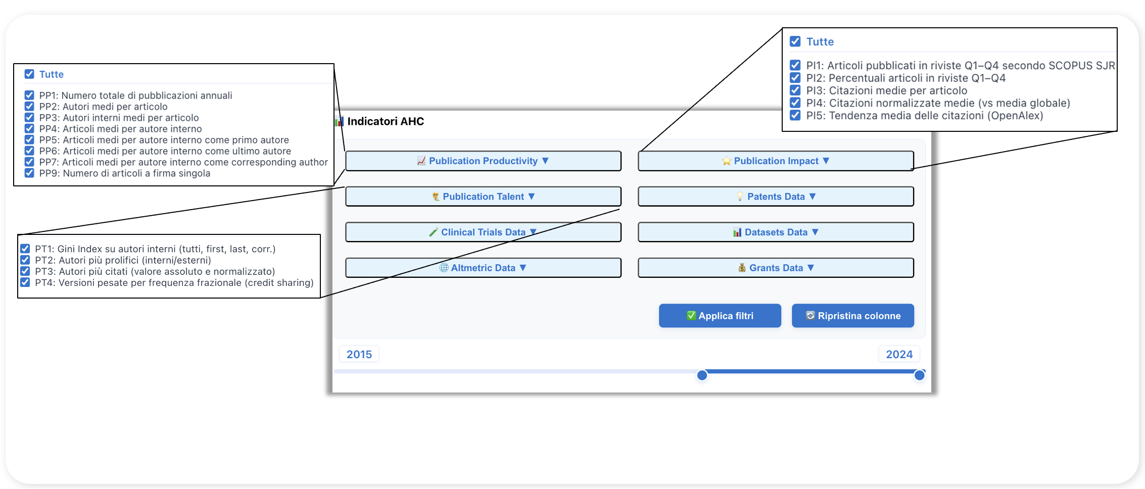 Managers can select from over 100 performance indicators organized across the five key dimensions. The interface allows filtering by time period (2015-2024 slider), selecting specific indicator categories (Publication Productivity, Publication Impact, Publication Talent, Patents Data, Clinical Trials Data, Datasets Data, Altmetric Data, Grants Data), and exporting filtered data as CSV for further analysis.