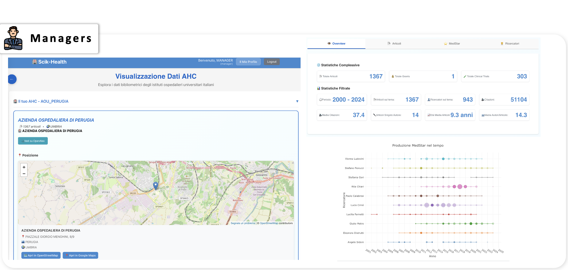 SciK-Health (Scientific Knowledge in Health) is an innovative web application designed to transform the scientific production of Italian Academic Health Science Centres (AHSCs) into actionable knowledge for citizens, healthcare professionals, policymakers, and researchers.