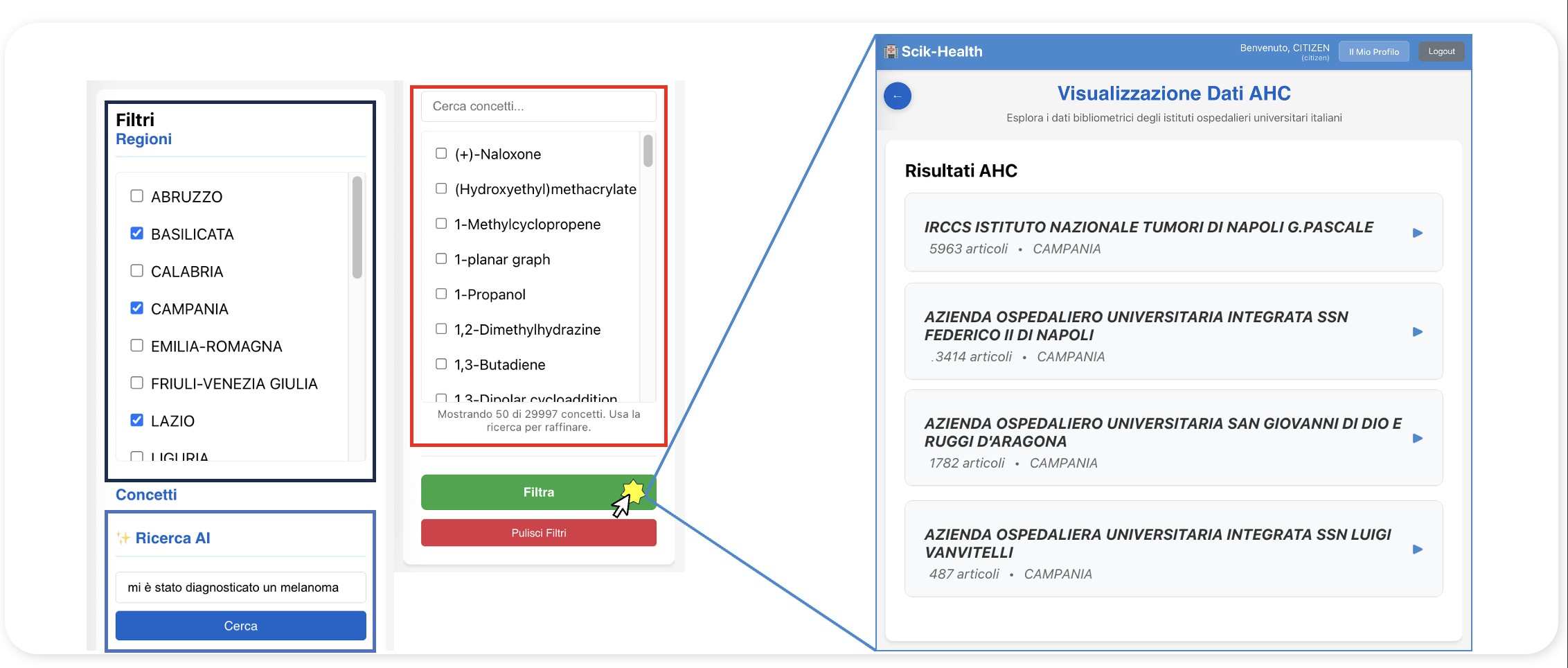 - Unified Search: A single query interface to explore diseases, treatments, and research centers across all Italian AHSCs